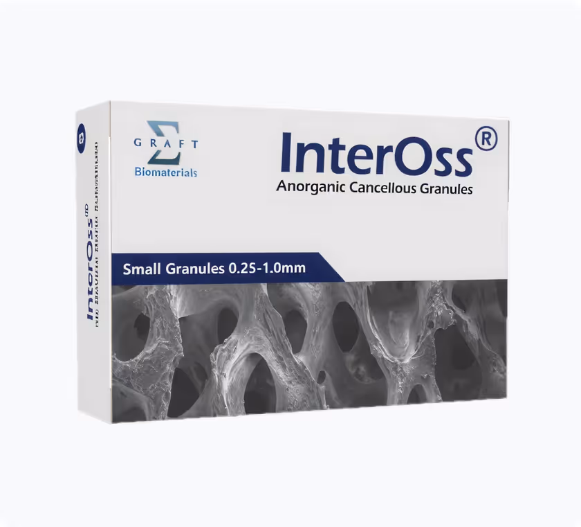 InterOss® is een natuurlijk hydroxyapatite botsubstituut afkomstig van Australisch runderbot (BSE-vrij). Dit sterk gezuiverde osteoconductieve materiaal wordt geproduceerd uit natuurlijk bot door middel van een meervoudig zuiveringsproces. De natuurlijke oorsprong maakt InterOss® chemisch en structureel vergelijkbaar met gemineraliseerd menselijk bot (nanokristallijn natuurlijk apatiet).